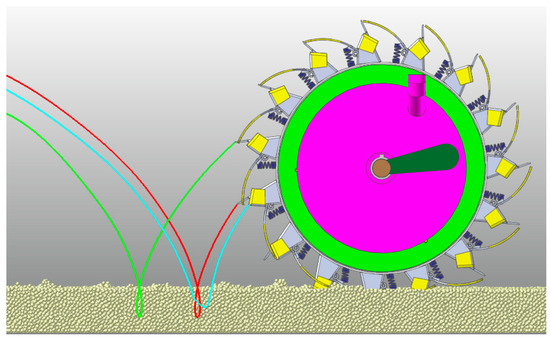 In order to investigate the influence of different parameters on the hole-forming trajectory of the hole-forming device, the forward speed, traction angle, and mass of the hole-forming device were used as control parameters, and the hole-forming process of the hole-forming device was simulated in a coupled manner. The simplified burrower model is imported into EDEM software, the simulation time is set to 1 s, and the time step is 2 × 10−4 s in EDEM software. The simulation time is set to 1 s, and the step is 500 in RecurDyn software, and the hole-forming process of the hole-forming device is coupled and simulated through the coupling interface.