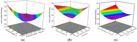 Effect of traction angle, forward speed, and mass of the hole-forming device on planting depth, (a) effect of traction angle and forward speed on planting depth; (b) effect of traction angle and mass of the hole-forming device on planting depth; (c) effect of forward speed and mass of the hole-forming device on planting depth.
