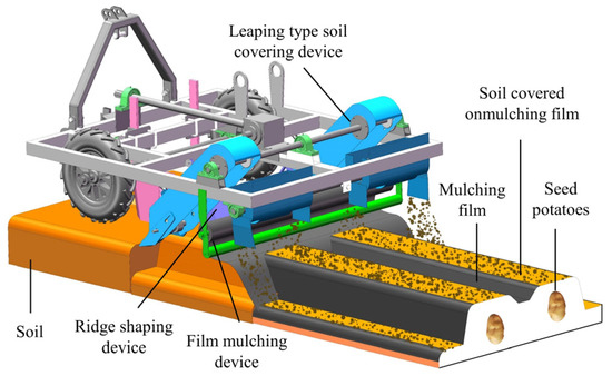Studies have shown that potato shoots can naturally penetrate the film [3,4]. Therefore, following film sowing, covering the seeds with a 30–50 mm soil layer is crucial. This ensures darkness for the germinating buds, preventing cotyledon separation, and relying on natural forces—the upward growth of shoots and soil pressure—to achieve seedling emergence without manual intervention [5]. As a result, potato full-film coverage technology has become a significant advancement in crop planting [6,7,8].