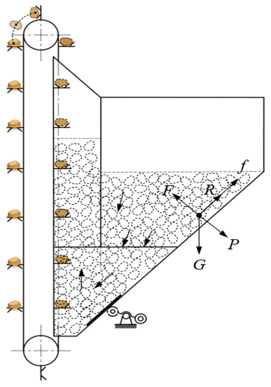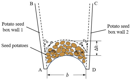In the arched seed potato layer (see Figure 6), assuming that the applied stress on the surfaces AB and CD of the seed box wall is , the stress can be divided into the shear stress and normal stress . Let A be the area of the hole and L be the perimeter of the hole. Assuming that the shear stress is approximately constant along the entire perimeter of the hole, when the seed potatoes inside the seed box reach a state of stress equilibrium, a stable arch is formed. The force balance equation [24] for the stable arch is as follows: