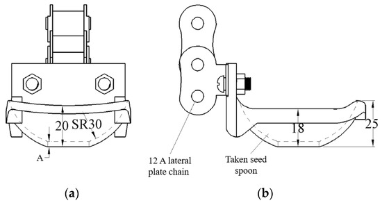 Calculated from the above formula, the seed spoon spacing is 128~143 mm, with a middle value of 136 mm. The machine seed discharger adopts a 12A-type chain with a chain pitch of 19.05 mm. So, every seven sections are arranged with double side curved plates to install the seed spoon, as shown in Figure 5. Among the many factors affecting the performance of the spoon chain seeder, the size of the seed spoon and the seed capacity height (the length of the discharging chain buried in the seed layer) are the most critical. The weight of cubed potatoes is about 50 g, and the density of potatoes is between 1000 and 1200 kg/m3. Therefore, the equivalent diameter of cubed potatoes is between 34.2 and 36.2 mm. Considering the large differences in the shape of cubed potatoes, the inner wall of the seed spoon is SR30 mm spherical with a depth of 18 mm. Likewise, in order to improve the performance of seed filling, the height of the seed spoon’s opening is made greater than the height of its sides and the mouth of the spoon adopts a large radius arc.