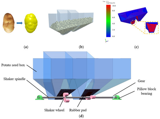 EDEM analysis of the seed box arch-breaking device: (a) physical seed potato and discrete element model; (b) schematic diagram of the simulation process of seed potato filling the seed box; (c) load distribution of the seed box when the seed potato fills the seed box; (d) schematic diagram of the seed box arch-breaking device.