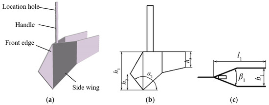 The technology of promoting growth by covering soil above the film requires that the soil covering strip aligns up and down precisely with the seed row to prevent the stem sprouts from hitting the exposed mulch which can cause high-temperature damage to the seedlings. For this purpose, a sharp and wing-shaped furrow opener was designed. The dry-farming mulch-covering potato cultivation technique demands high uniformity, and stability in sowing and controlling seeding depth is also a crucial factor. As shown in Figure 8, the opener consists of a front blade, side wings, and a shovel handle. The front blade cuts through the stubble (in the dry-farming areas of the northwest Loess Plateau, potato or corn rotation is commonly used) and the side wings form a “V”-shaped seed trench, ensuring the stability of the potato pieces at the bottom of the trench. The height of the front blade h2 is set as 130 mm consistent with the seeding depth; the height of the side wing plate h1 is set as 270 mm, and the rear wing height h3 is set as 100 mm; the width of the opener b1 is slightly larger than the width of the seed protection trough set as 85 mm; to ensure the front blade’s slicing action on the soil, α1 > π/2 + φ1, where φ1 is the friction angle between the soil and the blade, φ1 = 14°~38°, and α1 is set to 128°; and to allow the soil on the side wing surfaces to slide backward and reduce working resistance, β1 < π − 2φ1, and β1 is set to 104° [28].