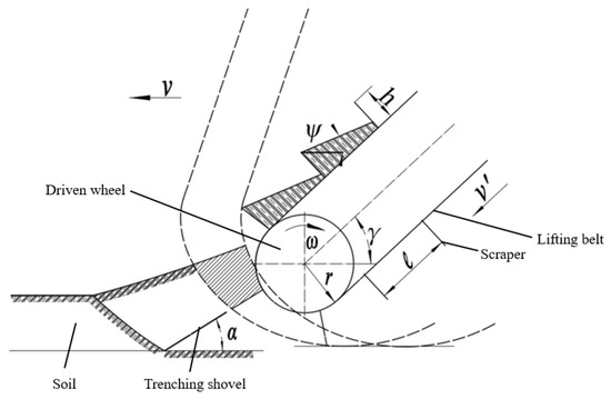 In Figure 11, ω is the angular velocity of the driven wheel in rad/s; v is the forward velocity in m/s; H is the depth of plowing in mm; γ is the angle between the lifting belt and the horizontal plane; ψ is the soil internal frictional angle; r is the radius of the driven wheel in mm; h is the height of the scraper in mm; l is the scraper spacing in mm; v′ is the velocity of the lifting belt in m/s; δ is the clearance between the scraper and bottom in mm; α is the penetration angle of the trenching shovel.