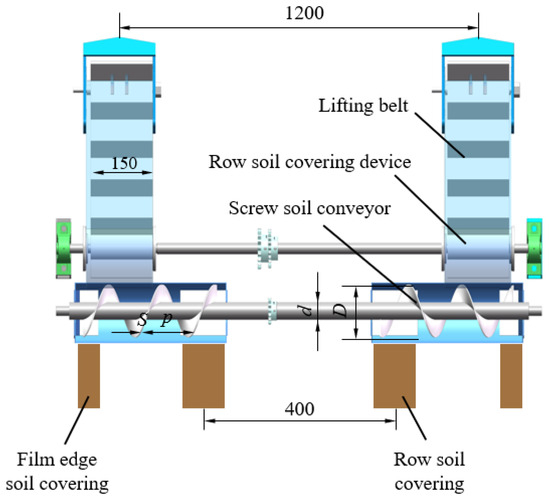 After the soil excavation process, ridge furrows are formed on the ground with a spacing of 1200 mm between them. This means that the distance between the centers of the two sets of soil-covering devices on the film is 1200 mm. The row spacing (refers to the distance between two trenchers) is set at 400 mm. In order to ensure that the soil is properly covered directly above the rows, the soil lifted by the conveyor belt needs to be laterally transported to a certain distance. To achieve this, a helical conveyor is used for lateral soil transportation as illustrated in Figure 12. The width of the scraper conveyor belt is b = 150 mm while the desired soil coverage width is 170 mm. To enhance the debris removal capability of the conveyor and prevent blockages caused by crop residues and stones, the helical conveyor was designed with an outer diameter D = 150 mm, a shaft diameter d = 48 mm, an auger pitch p = 150 mm, and a clearance λ = 5 mm between the blades and the bottom shell. Moreover, to improve the structural strength of the conveyor and protect the blades from damage, unequal thickness blades are employed with a thickness s1 = 2.5 mm and a total thickness s = 5 mm [20].