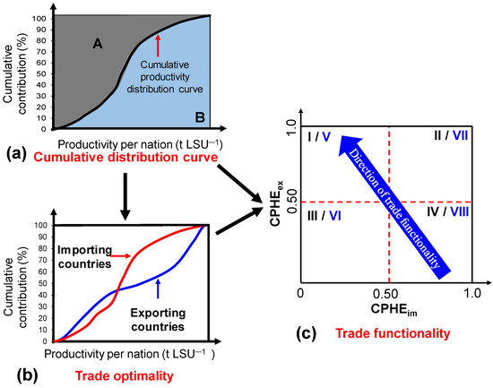 The illustration of the cumulative distribution curve used to determine the concentration of production in high-efficiency countries (CPHE, equal to the area of A/(A + B) (a), and illustration of the theory of trade optimality (b) and trade functionality (c), with the curve and theory derived from Bai et al. (2021a) [19].