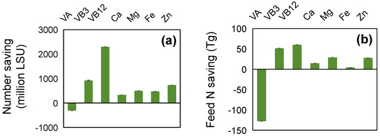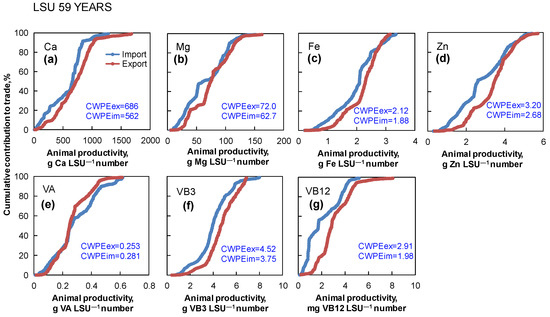 The cumulative potential reduction in livestock numbers due to international trade of livestock products varied between −200 million LSU for VA and 2200 million LSU for VB12 annually over the period 1961–2019 (Figure 4a). Approximately 1000 million LSU was reduced through trade for VB3 and Zn production, while the reduction rate was halved to around 500 million LSU when productivity was based on Ca, Mg, and Fe (Figure 4a).