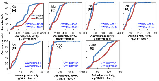Over the past 59 years, the trade of livestock products has been optimal for all micro-nutrients in terms of livestock productivity per LSU and partial factor productivity of feed N, except for vitamin A (Figure 7c,f). The optimality of the trade has increased over the past six decades for all seven selected micro-nutrients, as reflected by the enlarged CWPEex/CWPEim ratio (Figures S2–S15) and the increasing potential reduction in livestock units and feed N (Figure 6). This increase in trade optimality, based on protein and calorie productivity, has also been reported in previous studies (Bai et al., 2021a, 2023) [19,20]. This trend is attributed to the intensification of livestock production, resulting in higher productivity in exporting countries compared to importing countries, which is a common outcome of globalization. Additionally, the optimality, determined by the CWPEex/CWPEim ratio, generally decreased in the order of VB12, Ca, VB3, Zn, Mg, Fe, and VA over the period from 1961 to 2019 (Figure 7c,f).
