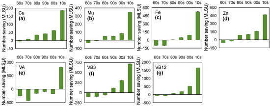 Potential reduction or increase in livestock units through trade in different decades for calcium Ca, (a), magnesium Mg, (b), iron Fe, (c), zinc Zn, (d), vitamin A VA, (e), VB3 (f), and VB 12 (g). Note: The x-axis refers to 1960s (60s), 1970s (70s), 1980s (80s), 1990s (90s), 2000s (00s) and 2010s (10s).