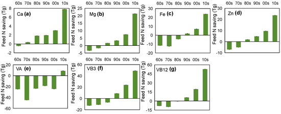 Potential of reducing or increasing feed nitrogen (N) through trade in different decades for calcium (Ca, a), magnesium (Mg, b), iron (Fe, c), zinc (Zn, d), vitamin A (VA, e), VB3 (f), and VB12 (g). Note: The x-axis refers to 1960s (60s), 1970s (70s), 1980s (80s), 1990s (90s), 2000s (00s), and 2010s (10s).