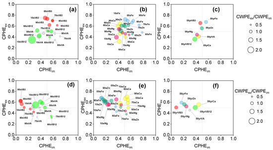 The trade functionality and optimality in terms of livestock productivity (upper panel) and partial factor productivity of feed nitrogen (N) (bottom panel) for vitamin A (VA), VB3, and VB12 (a,d), and for calcium (Ca), magnesium (Mg), iron (Fe), and zinc (Zn) (b,e) in the 1960s (60s), 1970s (70s), 1980s (80s), 1990s (90s), 2000s (00s), and 2010s (10s), and for all micro-nutrients over the 59 years (59yr) from 1961 to 2019 (c,f). Note: CPHE is the concentration of export or import by the high-efficiency exporting or importing countries, respectively. They are dimensionless, with values ranging between 0 and 1.0. The size of the circles represents CWPEex/CWPEim. The red solid dots represent positive trade optimality (levels I–IV; that is, CWPEex/CWPEim ≥ 1.0); the blue solid dots represent negative trade optimality (levels V–VIII; that is, CWPEex/CWPEim < 1.0). Different colors represent different micro-nutrients.
