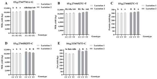 Phenotypes of milk production traits for genotypes in different SNPs. (A) Milk yield of different genotypes in 15:g.27447741A>G; (B) milk yield of different genotypes in 15:g.27446527C>T; (C) protein yield of different genotypes in 15:g.27446527C>T; (D) milk yield of different genotypes in 15:g.27445825T>C; (E) fat yield of different genotypes in 16:g.33367767T>C. a or b indicate significant differences between the phenotypes of milk production traits of different genotypes (p ≤ 0.05); A or B indicate extremely significant differences between the phenotypes of milk production traits of different genotypes (p ≤ 0.01).