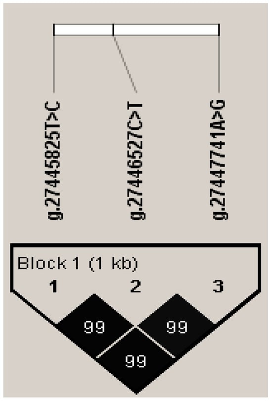 We estimated the degree of LD among the identified SNPs in APOA5 and AKT3 using Haploview4.2 and found that one haplotype block including three SNPs, 15:g.27447741A>G, 15:g.27446527C>T, and 15:g.27445825T>C, in the APOA5 gene was inferred (R2 = 0.99; Figure 2). In the block, the frequencies of the H1 (CTG) and H2 (TCA) haplotypes were 66.7% and 31.7%, respectively. The block was significantly associated with milk yield, fat yield, and protein yield in both lactations (p ≤ 0.05; Table 2). H1H1 was the best haplotype for milk yield, and H2H2 was the worst. However, we found no LD for the three SNPs in the AKT3 gene.