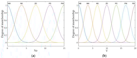 In this paper, Ne (engine speed) is divided into five fuzzy sets, i.e., “Negative Medium” (NM), “Negative Small” (NS), “Zero” (ZO), “Positive Small” (PS), “Positive Medium” (PM); V (vehicle speed) is divided into seven fuzzy sets as follows: “Negative Big” (NB), “Negative Medium” (NM), “Negative Small” (NS), “Zero” (ZO), “Positive Small” (PS), “Positive Medium” (PM), “Positive Big” (PB); Pump (variable pump displacement) is divided into seven fuzzy sets of “Negative Big” (NB), “Negative Medium” (NM), “Negative Small” (NS), “Zero” (ZO), “Positive Small” (PS), “Positive Medium” (PM), “Positive Big” (PB); M1 (displacement of the front variable motor) is divided into seven fuzzy sets of “Negative Big” (NB), “Negative Medium” (NM), “Negative Small” (NS), “Zero” (ZO), “Positive Small” (PS), “Positive Medium” (PM), “Positive Big” (PB); and M2 (displacement of the rear variable motor) is divided into seven fuzzy sets of “Negative Big” (NB), “Negative Medium” (NM), “Negative Small” (NS), “Zero” (ZO), “Positive Small” (PS), “Positive Medium” (PM), and “Positive Big” (PB). Usually, fuzzy subsets cover the fuzzy domain better when the total number of fuzzy domain elements is two to three times the total number of fuzzy subsets [13], so the fuzzy domain of Ne is set to (0, 15), the fuzzy domain of V is set to (0, 20), the fuzzy domain of Pump is set to (0, 20), the fuzzy domain of M1 is set to (0, 20), and the fuzzy domain of M2 is set to (0, 20). According to the requirements of the test data, the variation interval of Ne is [400, 2100], the variation interval of V is [0, 28], the variation interval of Pump is [0, 100%], the variation interval of M1 is [0, 100%], and the variation interval of M2 is [0, 100%].