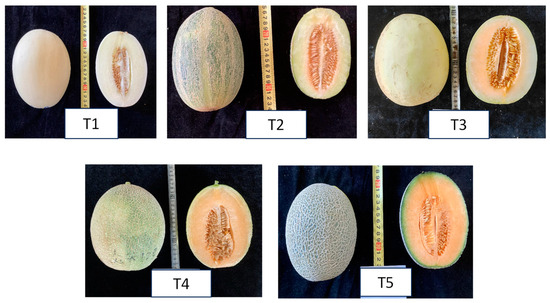 Profile photos of the five melon varieties (T1 was Zhongtianxueqiong; T2 was Zhongtian No. 9; T3 was Zhongtian No. 8; T4 was Zhongtian No. 12; T5 was Kangbing F3800).