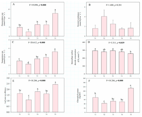 The photosynthetic rate was significantly higher in sample T5 than in samples T3 and T4, which, in turn, were higher than those of samples T1 and T2 (Figure 2A). Powdery mildew had no significant effect on the stomatal conductance of melon leaves (Figure 2B). The transpiration rate was significantly higher in sample T5 and significantly lower in sample T2 (Figure 2C). The intercellular carbon dioxide concentration was significantly higher in samples T1 and T3 than in sample T5 (Figure 2D). Leaf water use efficiency was significantly higher in sample T5 and significantly lower in sample T2 (Figure 2E). T5 had the highest chlorophyll content than the other treatments, and T2 had the lowest chlorophyll content than the other treatments—especially, chlorophyll content of T2 accounted for 37.8% of T5 (Figure 2F).