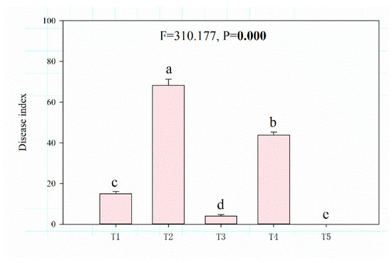 The powdery mildew disease index varied across melon samples. The leaves of sample T5 had no powdery mildew and were immune, with a disease index of 0 (Figure 3). The disease index of sample T3 was significantly lower than that of sample T1, a moderately resistant variety. Conversely, the disease index of sample T4 was significantly higher than that of T1. Finally, the highest disease index was observed for sample T2, which was a susceptible variety (Figure 3).