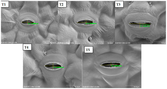 The number of open stomata in the upper epidermis of the leaves was the highest (79) in sample T3 and the lowest (38) in T4 (Figure S1 and Table 2). T1 and T4 presented no closed pores in the upper epidermis. In contrast, the resistant T5 variety displayed 22 closed pores in the upper epidermis. The maximum number of stomata on the leaves of T3 was 87, whereas the minimum number on the leaves of T4 was 38 (Figure S1 and Table 2). T1 and T4 had the highest stomatal opening and closing rates (1.00). T4 exhibited the highest upper epidermal stomatal length (17.43) and width (4.32). Instead, T2 showed the lowest upper epidermal stomatal length (10.36) and T5 the lowest upper epidermal stomatal width (2.77) (Figure 4 and Table 2).