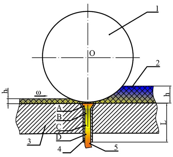 The pelletizer is categorized into three distinct zones based on the material states during the pelletizing process: the feeding zone situated between the flat die and the pressure rollers, the deformation compression zone, and the extrusion molding zone. The extrusion molding of the material particles is primarily segmented into the loose stage, excessive stage, and pressure stage [20]. The molding process is illustrated in Figure 2. In the loose stage, the material particles are in a discrete state with large gaps between them, and the particles have not yet bonded to form larger particles. The particles mainly experience the squeezing force from the pressure roller between the particles and the flat die, as illustrated in region A of Figure 2. During the excessive stage, the space between the material particles becomes very narrow, leading to particle deformation while maintaining unchanged structure and physical properties. This stage is characterized by elastic deformation, as depicted in region B of Figure 2. The subsequent extrusion results in molecular structure changes between the particles, leading to sliding, shearing, and stretching phenomena. This stage marks the onset of primary plastic deformation between the particles, with increased radial pressure, modular friction wear, and evident power consumption. As the material particles undergo plastic deformation, their physical properties, density, and hardness increase. When the material particles are on the verge of being extruded from the die hole, signifying the completion of plastic deformation between the particles, the pressure beneath the lower part of the die hole is suddenly released. This release causes the expansion of the molded material particles, as depicted in region C.