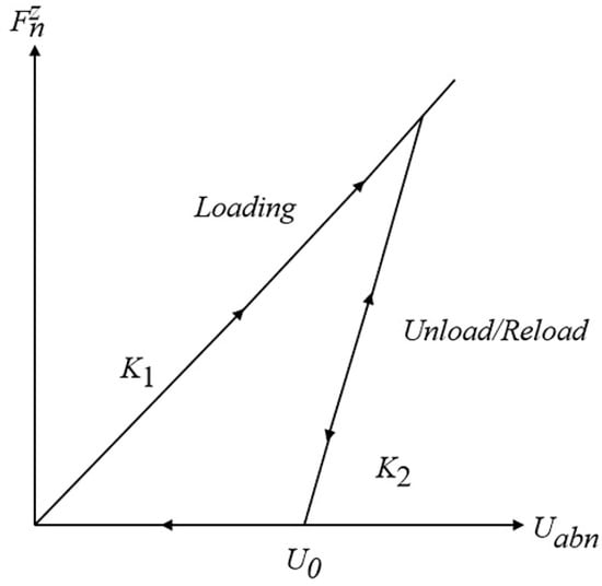 where K1 is the loading stiffness; K2 is the unloading stiffness; is the average overlap, and is the residual overlap. The relationship between K1 in Equation (1) and the yield strengths of the materials ReL1 and ReL2 is as follows: