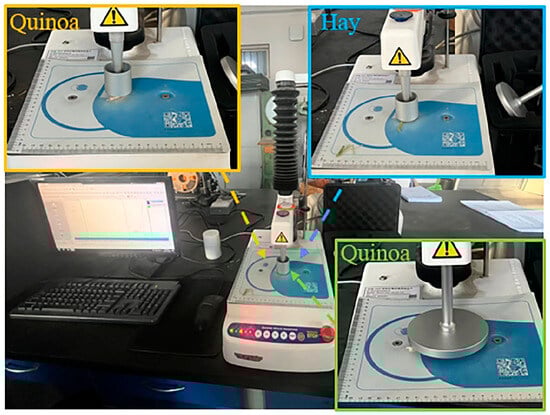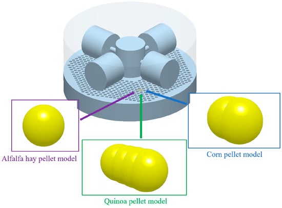 Three types of powders, corn, alfalfa hay, and quinoa straw, were used as raw materials for pelletizing. The Poisson’s ratio and shear modulus of corn powder were obtained from the literature [28]. The Poisson’s ratio of alfalfa hay and quinoa straw was determined using a Stable Micro Systems texture instrument for mechanical characterization. Pressure was applied along the longitudinal direction of the samples until they were no longer deformed. A testing machine measured the longitudinal deformation, while the transversal deformation was obtained using digital vernier calipers [29]. The mean value was calculated by repeating the process several times. The measured Poisson’s ratio is represented by Equation (6):