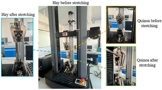 The shear modulus of alfalfa hay and quinoa straw was tested in tension using a CMT5305 microcomputer-controlled universal testing machine (Shenzhen, China, SANS Company), and the average value was obtained by repeated measurements. The modulus of elasticity was also measured. Additionally, the shear modulus is represented by Equation (7):