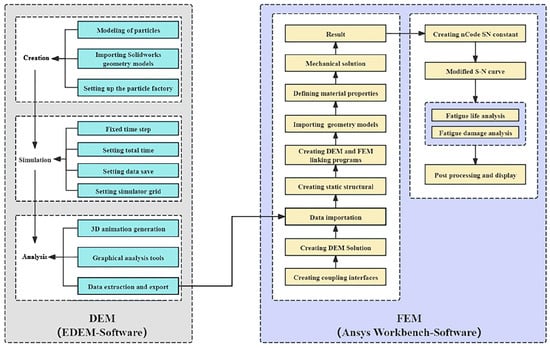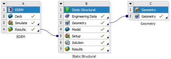 In this study, unidirectional coupling was conducted using the DEM-FEM method. The numerical simulation of the granulation process was initially carried out using EDEM software, and then the data from the numerical simulation were imported into Ansys Workbench. The specific workflow is illustrated in Figure 6.