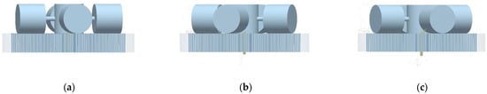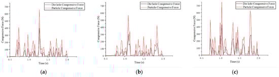 Based on the crushing of the mixture before pelletizing, particle sizes of 0.32 mm, 0.2 mm, and 0.26 mm were assigned to represent the crushed corn, alfalfa hay, and quinoa stover powder, respectively. The roller speed was set to 400 r/min according to actual pelletizing conditions. To investigate the wear of the die hole with different strip ratios, proportions were established based on the commonly used feeding ratios of the materials, as depicted in Table 3. The particle compressive force–time curves and flat die compressive force–time curves were calculated and obtained for the mixing ratios of the three materials, as illustrated in Figure 9a–c, respectively.