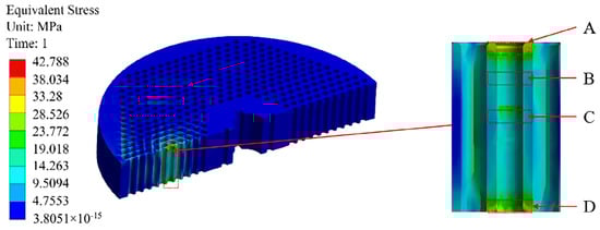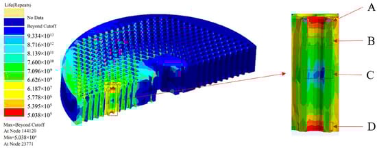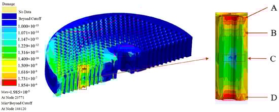 Figure 14 and Figure 15 indicate that areas with significant fatigue damage include the entrance (region A) and exit (region D) of the die hole. This is attributed to the higher stress levels experienced in these regions, with a minimum fatigue life of 5.0 × 105 cycles and cumulative fatigue damage of 1.9 × 10−6 at the entrance, and a minimum fatigue life of 5.4 × 105 cycles and cumulative fatigue damage of 1.7 × 10−7 at the exit of the die hole. This is primarily due to the abrupt change in the cross-sectional shape of the die hole at the entrance and exit, leading to stress concentration. The middle region of the die hole (region B to C) has a minimum fatigue life of 6.6 × 109 cycles and a cumulative fatigue damage of 1.0 × 10−10. To enhance the lifespan of the die hole, modifications can be made to the shape of the die hole inlet and outlet, or a higher abrasion-resistant material can be utilized at the two ends of the die hole to improve service life.