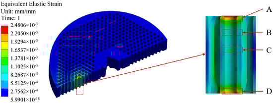 During the extrusion molding of mixed materials, as materials enter outside the die hole continuously and the contact distance between the material particles decreases, the particles among the fibers start to exhibit behaviors such as mutual bridging and interspersing. This leads to the generation of extrusion and friction forces between the materials, causing variations in the forces at different locations on the die hole [33]. In Figure 11 and Figure 12, it is observed that different parts within the flat die hole experience varying forces. The area near the entrance of the die hole (Figure 11 A area) exhibits the most significant force, with a maximum equivalent stress of 42.8 MPa and a maximum equivalent elastic strain of 2.4 × 10−3. This is primarily due to the energy required for the transition of the material from a loose state to a molded state. As the material forms particle prototypes, its surface roughness increases, leading to substantial friction within the flat die hole. Moreover, this area is exposed to friction from the pressure roller, further contributing to the high forces experienced in this region. As the material progresses downwards through the B area in Figure 11, the die hole experiences the minimum stress and strain within the entire die hole. The minimum equivalent stress in this region is 4.8 MPa, with a minimum equivalent elastic strain of 2.8 × 10−4. This is attributed to the fact that the material is being extruded into cylindrical particles in this region, resulting in lower stress and strain than in other areas of the die hole. The softening of material particles leads to heat generation within the die hole. As the material moves from area A to area B, the surface roughness of the particles decreases due to friction, resulting in smoother particle surfaces in area B. When the material is pushed into the C region, the equivalent stress strain on the die hole increases compared to the B region. In this region, the material undergoes continued extrusion, leading to a reduction in the contact distance between the material particles and an increase in the material hardness. This rise in hardness causes an increase in the force exerted by the particles on the surface of the die hole. As the material is extruded to the exit of the die hole (area D in Figure 10 and Figure 11), the equivalent strain on the die hole further increases but remains lower than that in area A. This is because area D is located at the exit of the die hole. When the particles reach this area, there is a noticeable decrease in the external force acting on the particles. The volume undergoes a slight expansion, leading to a stress concentration at the die hole’s edge.