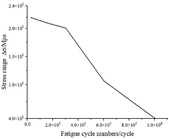 During the pellet molding process, the die hole is subjected to continuous extrusion by the material and pressure roller, making it vulnerable to cyclic fatigue, bending stress, and contact stress. The material is constantly extruded into the die hole, which can result in fatigue damage to the die hole after multiple cycles of superimposition, representing a form of high peripheral fatigue (stress fatigue) [34]. By utilizing predictive models for fatigue life and conducting thorough damage accumulation analysis of the die hole, engineers can establish the life expectancy and safety thresholds of the die hole in pelletizing operations. This approach enables engineers to design more resilient products and structures, enhance their reliability and safety, and provide guidance on implementing routine maintenance and inspections of molds. Ultimately, these practices contribute to prolonging the service life of materials and structures, reducing maintenance costs, and mitigating the risk of accidents. Stress fatigue analysis [35] can be conducted by developing the S-N curve of the material under consideration. In this study, the theoretical S-N curve is initially established in Ansys nCode DesignLife based on the flat die material (20CrMnTi), and then adjusted according to the material’s tensile limit to derive the accurate S-N curve, as illustrated in Figure 13 [36]. This corrected S-N curve represents the fatigue characteristics of the die hole material. Subsequently, the outcomes obtained from the static structural module are imported into the nCode SN Constant module to generate the fatigue life map and fatigue damage map of the die hole, depicted in Figure 14 and Figure 15.
