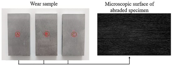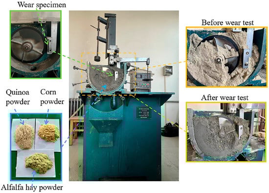 The MLS-225 rubber wheel type three-body abrasive wear tester was utilized at room temperature for the wear specimen test, as illustrated in Figure 17. The test employed the rotational friction method. The gap between the specimen and the rubber wheel was set at 0.1 mm by adjusting the rolling distance. A load of 225 N was applied using a weight. As the mixed material entered the gap from the rubber wheel, the load started to have an effect. The adjustment of the rolling distance ensured that the gap between the specimen and the rubber wheel remained constant throughout the test. Consistent with the EDEM simulation conditions, the speed of the rubber wheel was set at 400 r/min, and the mixture proportions were varied. The test was conducted in three groups, with each test lasting for 4 h.