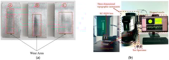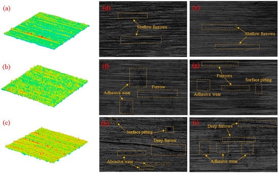According to the Table 7 analysis, in terms of average height, the surface height of specimen C is greater than that of specimen A and specimen B. Furthermore, considering the height difference and arithmetic mean height, specimen C exhibits the greatest surface fluctuation and roughness. Therefore, it can be inferred that the surface wear condition of specimen C is more severe compared to specimen A and specimen B.