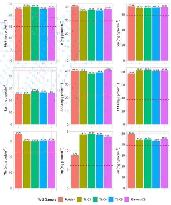Content of each essential amino acid (mg g total amino acids−1, as-is basis), represented by standard three letter codes, for each IWG sample, compared to the adult daily requirement (red dashed line) [33]. SAA, sulfur amino acids (methionine + cysteine); AAA, aromatic amino acids (phenylalanine + tyrosine); standard errors bars are not provided as each bar represents a single data point.