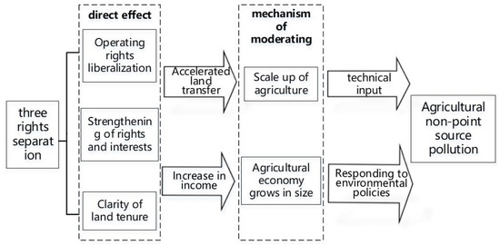 The reform of China’s land system has been a continuous and evolving process for the government since the country’s establishment. It not only fulfills the traditional concept of “land for the cultivator” but also plays a crucial role in balancing the relationship between urban and rural areas. The TRS, which separates ownership, contracting, and management of rural land, is a tangible example of the ongoing enhancement of the land system. Against this background, this paper conducts a case study, utilizing provincial panel data from 2011 to 2021 to analyze the impact of the TRS on Agnps and its mechanisms. This study found that (1) the TRS in all provinces of China has a significant inhibiting effect on the emission of Agnps as well as on the emission of TN, NH3-N, and TP pollutants. (2) The policy effect of TRS on pollution reduction is more obvious in provinces with a higher degree of agricultural scale and a larger agricultural economy. (3) Heterogeneity analysis shows that the TRS policy has a stronger effect on reducing Agnps in major food-producing provinces compared to those in non-food-producing regions. Moreover, the two pathways proposed in our hypothesis are not observed in the latter group.