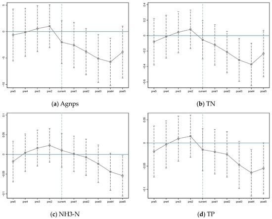 The robustness of difference-in-differences estimation hinges on the assumption of parallel trends, which suggests that, in the absence of policy intervention, the underlying trends for the treatment group and the control group would have remained consistent. This paper utilizes the event study approach to assess the trends in Agnps before and after the policy’s enactment, with the following specific configurations: