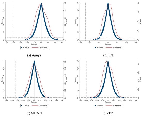 To more firmly establish a causal link between the TRS policy and the decrease in Agnps and to reduce the impact of other unseen factors on our findings, we conducted a placebo test using the approach suggested by Lu et al., (2017) [38]. Specifically, this paper randomly selects a subset of provinces from the sample of 30 provinces as the treatment group and re-estimates the benchmark model, thereby obtaining an estimated coefficient for a fictitious TRS policy variable. Furthermore, the aforementioned process is repeated 500 times to obtain 500 regression coefficient estimates for the core explanatory variable, along with their p-values. A kernel density distribution and a p-value combination plot are then created, as illustrated in Figure 3. As can be seen in Figure 3a, the coefficients based on the random samples follow a normal distribution and are centered around zero. Additionally, the majority of the regression coefficients have p-values greater than 0.01. The black dashed line represents the estimated coefficient from the benchmark model mentioned earlier, which is notably different from the mean of the kernel density distribution. Consequently, the policy effects of the TRS are not attributable to other random and unobservable factors, thereby confirming the reliability of the benchmark regression results presented in this study. Additionally, Figure 3b–d, which respectively considers TN, NH3-N, and TP as the dependent variables, shows a distribution of p-values and regression coefficients consistent with Figure 3a. This further substantiates the robustness of the policy effects.
