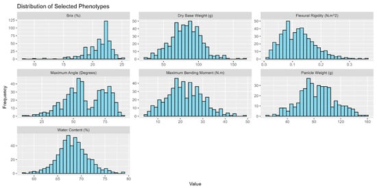Distribution of examined phenotypes. The plotted data represent a subset of the data collected from the Simon cultivar in 2019. The collected data were manually inspected and cleaned of outliers to ensure sound downstream analysis. While stalk Brix and flexural rigidity were slightly skewed, all observed phenotypes were normally distributed with a p-value < 0.01 following a Shapiro–Wilk test for normality.