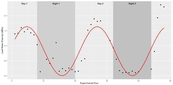 Diurnal trends in leaf water potential. Trends significantly follow a sinusoidal pattern with peaks in leaf turgor pressure during the afternoon hours and valleys in leaf water potential following sunset. The study started at 1 pm on Day 1, continued through the night (shaded background), and concluded at noon on the third day. The red trend line depicts the best-fit association modelled with y~A × in(B(x)) + D, where A is an amplitude of 1, B is the period needed to complete a full cycle (in this case 2π/24), and D is a vertical shift in the model (the average leaf water potential for the hour). The association is significant at a p-value < 0.001.