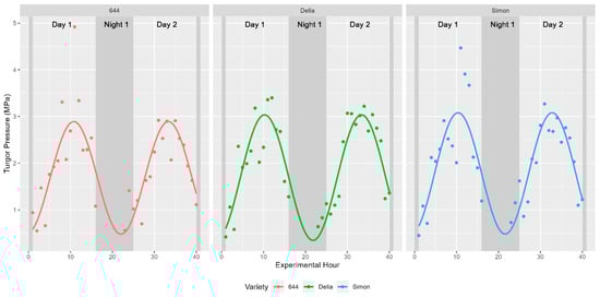Diurnal trends in turgor pressure. Trends were plotted as before for a separate dataset collected in 2020. Instead of water potential, the depicted values represent the collected measures of turgor pressure across individual plants for each cultivar examined.