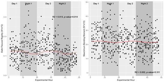 Diurnal variations in stalk stiffness and bending strength. Plotted values represent hourly measures of Simon stalk stiffness (left) and stalk maximum bending moment (right). Nighttime hours are depicted with a shaded background. While stalk stiffness varies significantly as a function of ToD (p-value 0.014), this association is marginal at best and explains only ~1.3% of the variation in stiffness across the 480 individuals measured.