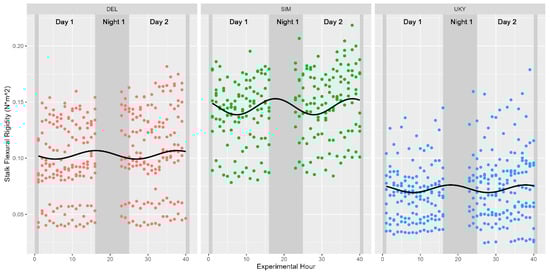 Stalk flexural stiffness (aka stalk flexural rigidity) is an essential, highly predictive trait for resistance against stalk lodging [15,16,17]. As herbaceous plants rely on turgor more than woody plants to maintain structural stiffness, prior studies have suggested that turgor pressure might play a significant role in the regulation of maize stalk strength and lodging resistance [3,15]. Despite this, little research has been carried out to quantify the direct effects of turgor pressure on grain stalk mechanical properties. Indeed, we are aware of only a single study found to directly explore the effects of turgor pressure on stalk stiffness in maize. Although the primary goal of the study was to explore how brace roots support stalk anchorage in maize, a sub-study comprising 23 maize plants measured at three time points (9 am, noon, and 4 pm) during the late vegetative phase of development was found to support a significant association between ToD and stalk stiffness [18]. Ultimately, the result of that study suggests that stalk stiffness might be reduced throughout the day. In parallel to this finding, prior studies have noted in herbaceous plants such as Arabidopsis, that a 10% loss in mechanical stiffness can result within 15 min of equilibration to room temperature and humidity [19].