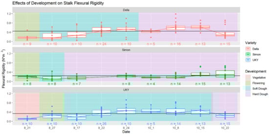 Our findings further suggest that stalk flexural stiffness potentially decreases at night. Although not statistically significant, the data note a clear trend across all cultivars examined, suggesting a possible vulnerability to lodging during nighttime hours. The agricultural implications of this vulnerability could be considerable, particularly in regions with strong nocturnal wind patterns. Furthermore, the significant changes in stiffness observed in our study across developmental stages align with earlier research indicating that plant maturation impacts stalk mechanical properties and lodging risk [28]. While this observation appears straightforward, it highlights the importance of timing harvest to avoid excessive risks of lodging during the final stages of cultivation when stalk strength is decreasing.