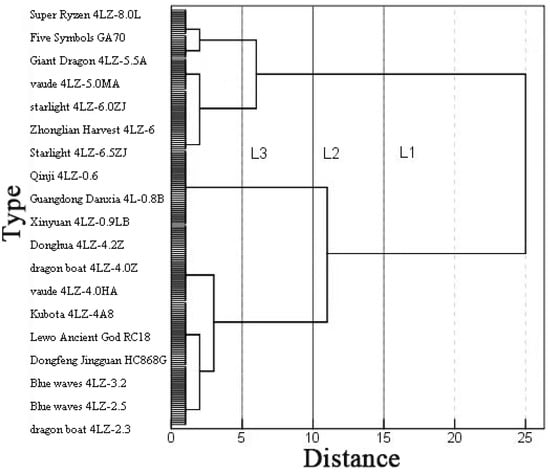 In this formula, represents the standardized value, is the original data for various parameters of the harvester, denotes the mean value of the parameter, and is the standard deviation of the parameter. After this transformation, each parameter’s mean becomes zero, and its variance equals one, making the harvester parameters comparable. The standardized data are presented in Table 3. Before conducting cluster analysis, each sample is initially treated as its own category. The distance between each sample is then calculated using the formula mentioned earlier, and the two samples with the closest distances are merged into one category. Depending on the specific requirements of the cluster analysis, an appropriate algorithm is selected to calculate the distance between clusters. Subsequently, the two closest clusters are merged repeatedly until all samples are classified into a single category. Finally, a dendrogram is drawn to provide an intuitive and quantitative description of the clusters obtained from the cluster analysis.