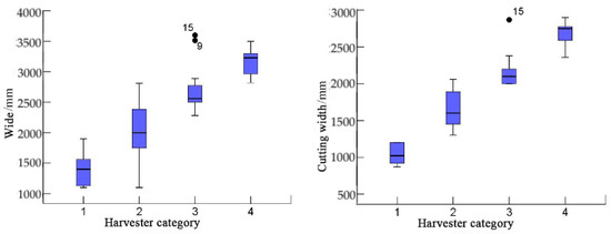 Cutting Width: The second boxplot illustrates that the cutting width, in millimeters (mm), increases with the size of the harvester, reflecting the greater capacity in larger machines.