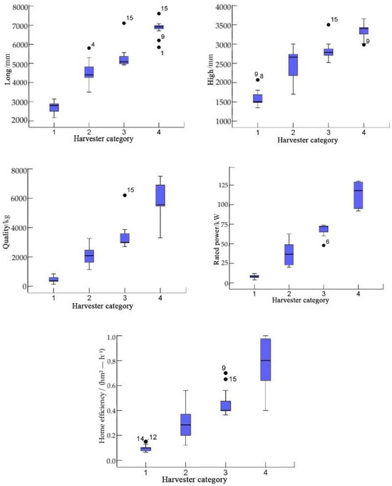 Boxplots are particularly effective for visualizing distributions and comparing groups, as demonstrated by Hao et al. [33], who utilized a processing workbench to analyze the equipment performance in agricultural settings. This aligns with our approach to visually represent and analyze variations in harvester specifications, supporting the distinct classification based on size and functional capabilities. The classification of harvesters into distinct types based on technical parameters, as observed through boxplot analysis, is thus well-supported by the existing literature, confirming the validity of our methodological approach and enhancing the credibility of our findings.