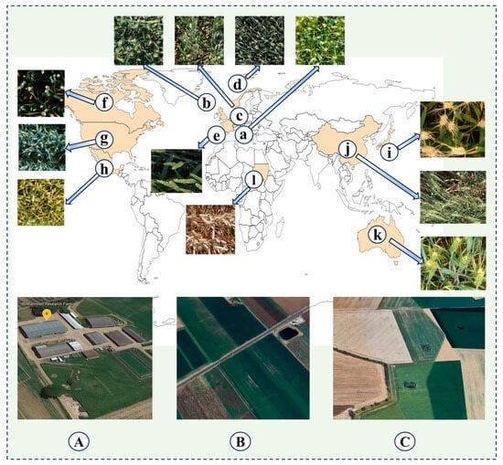 Distribution map of the Global Wheat Head Detection Challenge (GWHD2021) dataset. This dataset contains 6,422 images and 275,187 wheat spikes, covering 16 institutions across 12 countries/regions. Schematics A–C depict actual agricultural field images from some of the dataset’s collection locations. (A) Rothamsted Research Farm in the UK shows the row distribution of wheat spikes and the overall layout of the farm. (B) Gatton, Queensland, Australia, shows the wheat planting patterns adapted to the tropical climate. (C) Fields in Villiers le Bâcle, France, represent wheat cultivation under the temperate climate of Europe. Images (a–l) are actual field samples of wheat from various regions and environmental conditions, with specific countries/regions corresponding to the actual markings in the image. For example, (a) shows wheat cultivation in the mountainous conditions of the Swiss highlands. (i) Displays typical wheat from Japan. (k) Shows a typical dense distribution of wheat spikes in Australia.