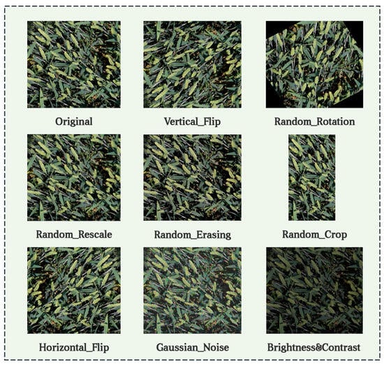 The augmentation techniques included geometric transformations such as random rotations (0° to 360°), horizontal and vertical flips, and random cropping. These transformations simulated the natural orientations and positions of wheat spikes in the field. Random rescaling was also applied to the images, simulating the effects of different camera distances and zoom levels, crucial for the varied camera focal lengths (10 mm to 50 mm) in the GWHD2021 dataset. To account for variations in lighting conditions, we introduced photometric enhancements such as brightness and contrast adjustments, as well as random shadows and highlights, creating a range of simulated lighting scenarios that might occur during data collection. Noise injection was another key aspect of our data augmentation strategy. This involved adding Gaussian noise to images, which helped the model become noise invariant, thereby stabilizing it against sensor noise or granularity, common under low-light conditions or with images from different sensor sizes in our dataset. Additionally, color enhancements were performed by altering the hue, saturation, and value (HSV) of the images, enabling the model to handle variations in soil and crop colors caused by different soil climate conditions and wheat genotypes in the dataset. Lastly, we employed random erasing by randomly deleting parts of images to introduce occlusions. This strategy was particularly effective for training the model to detect wheat spikes in the presence of obstacles, such as leaves or stems that might cover some spikes in the field. The augmented images were then merged into the training set to produce the final dataset, which included a balanced mix of original and augmented images, maintaining an 8:2 training to testing ratio. The effectiveness of the data augmentation techniques is shown in Figure 2. The augmented dataset comprised a total of 6750 images, with 5400 for training and 1350 for testing. The implementation of this comprehensive data augmentation strategy was expected to equip the model with the ability to reliably detect wheat spikes under various environmental conditions, reducing the model’s sensitivity to variance that could lead to detection inaccuracies.