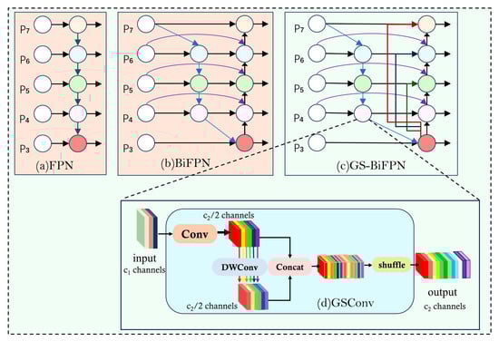 Comparison of feature pyramid network structures. (a) Displays the traditional FPN structure. (b) Reveals the enhanced strategy of BiFPN, which introduces additional top–down and bottom–up paths to foster richer interaction among features. (c) Is our proposed GS-BiFPN, which further enhances feature flow by direct connections and multi-point fusion to strengthen the propagation efficiency of multi-scale features. (d) Details the design of GSConv, a component that reduces computational complexity through grouped convolution and channel shuffling techniques while maintaining effective feature fusion capabilities.