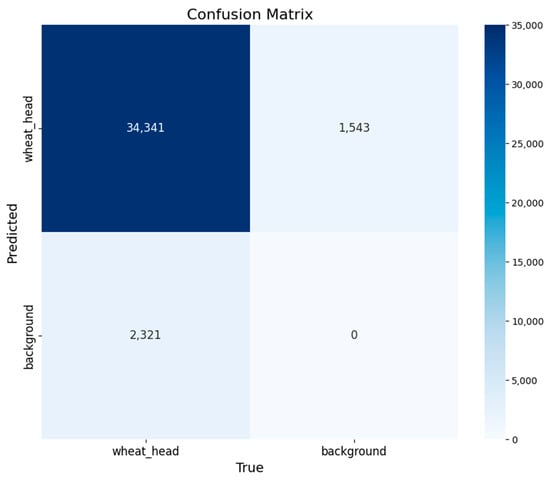 In this study, we evaluated the WH-DETR model for wheat spike detection and compared it against nine leading object detection algorithms, as summarized in Table 1. These included two-stage networks such as Faster R-CNN [21] and Mask R-CNN [45], one-stage networks like SSD [27], Centernet [29], YOLOv5 [24], and YOLOv8 [26], and Transformer-based variants like Deformable DETR [33], DINO-Deformable-DETR [46], and our baseline, RT-DETR [35]. WH-DETR achieved a score of 0.957 on the standard AP50 metric, surpassing these existing technologies. Particularly notable in terms of its parameter efficiency, despite YOLOv8 having more parameters (43 M compared to 37 M) and a slightly higher FPS (58.72 compared to 46.68), WH-DETR still outperformed in the AP50 metric, achieving 0.957, surpassing YOLOv8’s 0.912. Additionally, compared to Deformable DETR and DINO-Deformable-DETR, with AP50 scores of 0.878 and 0.895, respectively, WH-DETR established a new benchmark for performance. In terms of real-time processing capabilities, despite having fewer parameters (37 M vs. 47 M for DINO-Deformable-DETR), WH-DETR achieved a high FPS of 46.68, significantly enhancing real-time processing capabilities compared to 18.36. This advantage not only demonstrates WH-DETR’s meticulous balance of efficiency and performance, but also implies that, in resource-limited deployment environments, WH-DETR can operate more efficiently. Additionally, in Figure 7, the training loss curve comparisons showed significant performance advantages for WH-DETR, with faster and more stable loss reduction, validating the critical role of optimized loss functions in enhancing detection performance. The confusion matrix in Figure 8 further illustrates the performance of WH-DETR in distinguishing between wheat heads and background. The high accuracy of wheat head detection, with minimal misclassification, emphasizes the robustness and reliability of the WH-DETR model.